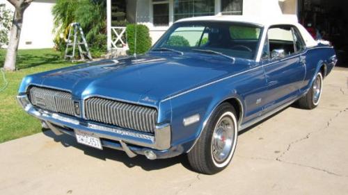 A 1967 Mercury Cougar. The headlight covers were vacuum powered, and didn’t come up at the same speed, so I could turn the lights on, then turn them off, wait a second, and turn them back on, and it would make it look like the car had just winked at you. Mine was a darker blue than this one. A small block V-8 in this one made it a bit of a hot rod, and really fun to drive.