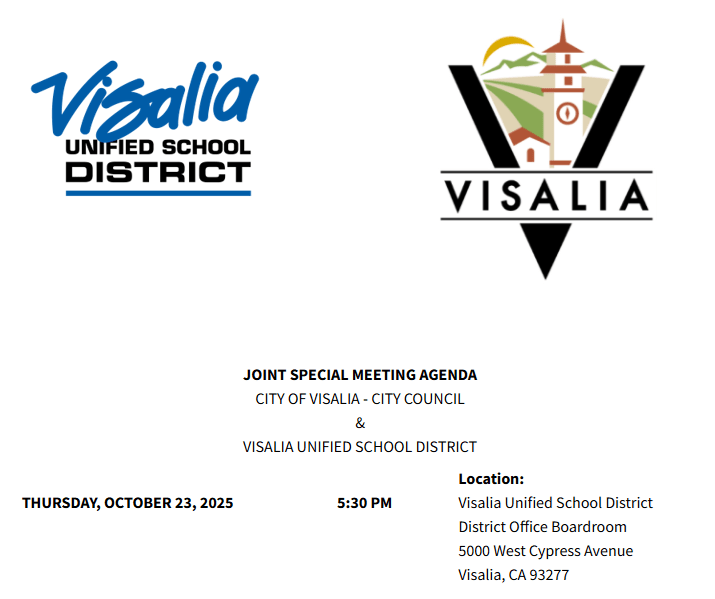 On October 23, 2025, the Visalia Unified School District held a special joint meeting with the Visalia City Council. This was the second such meeting held in 2025, and was held in the District’s Board room.