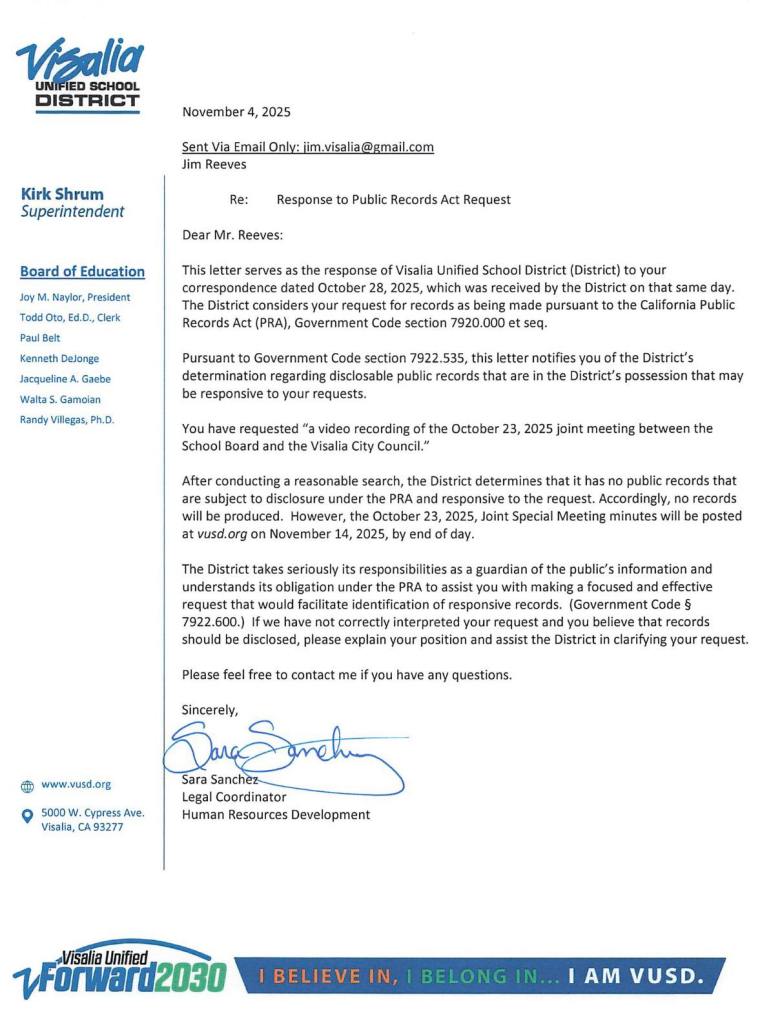 Visalia Unified School District/Visalia City Council meeting not recorded? Follow up –
