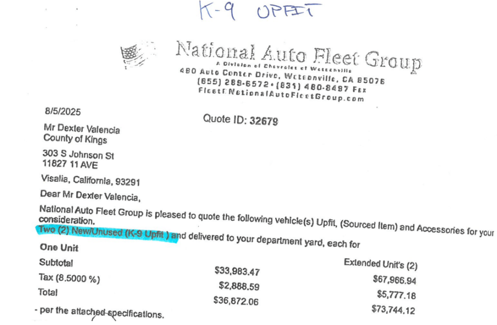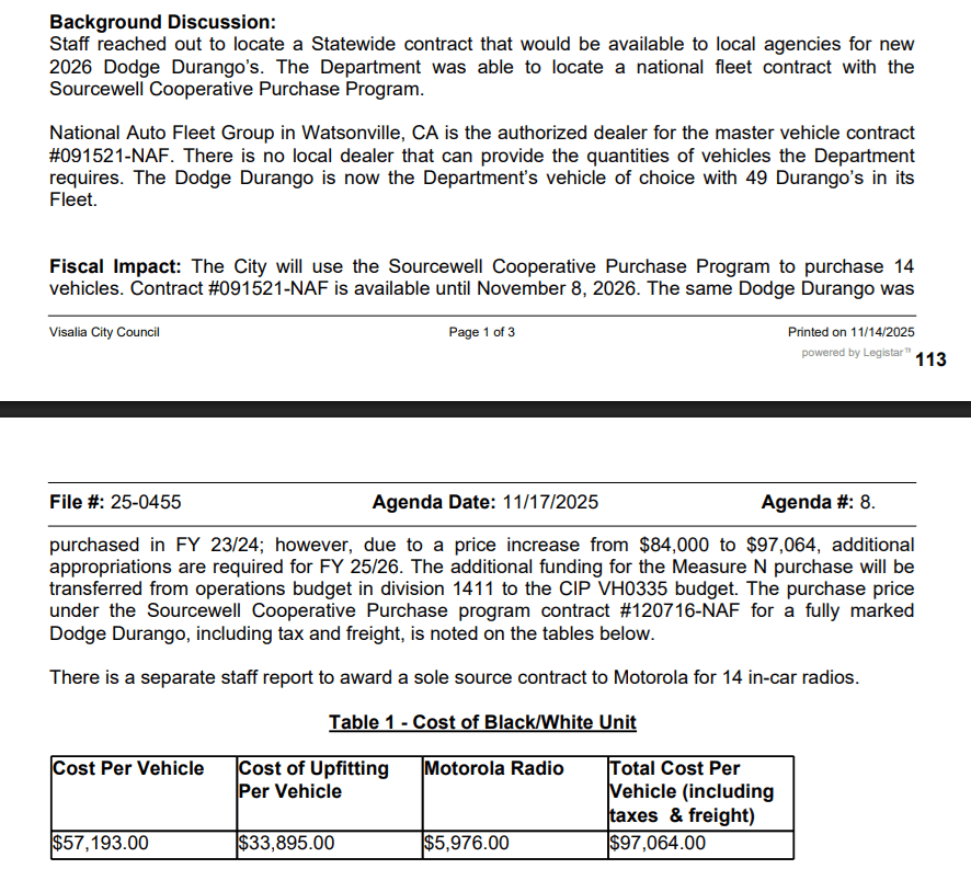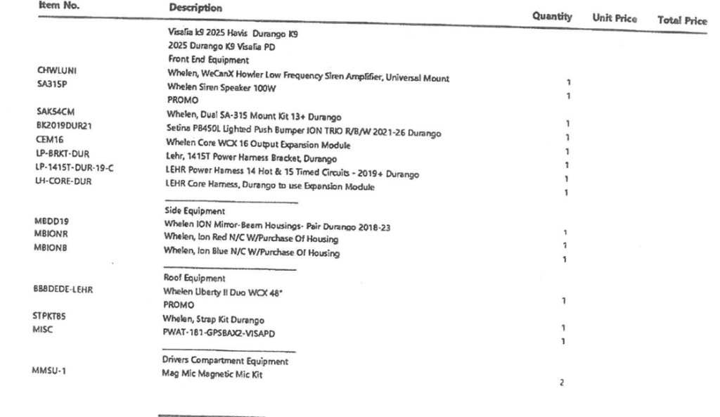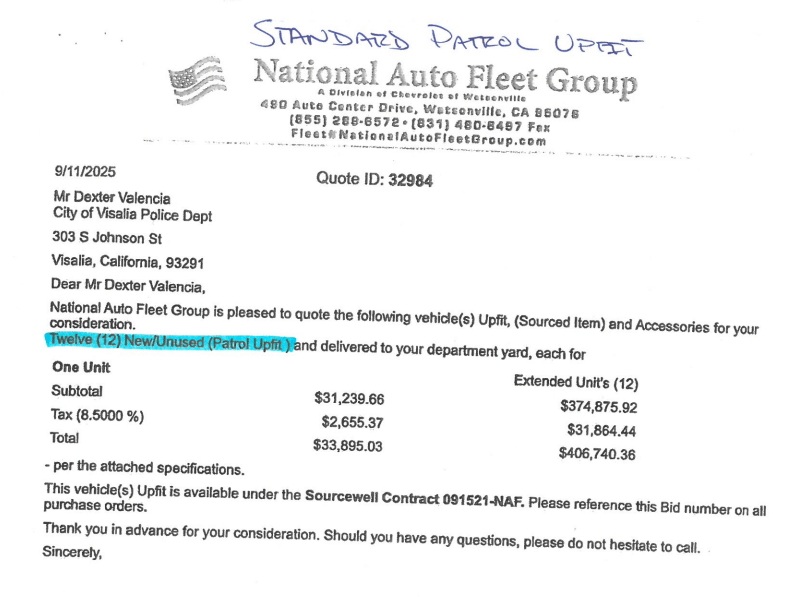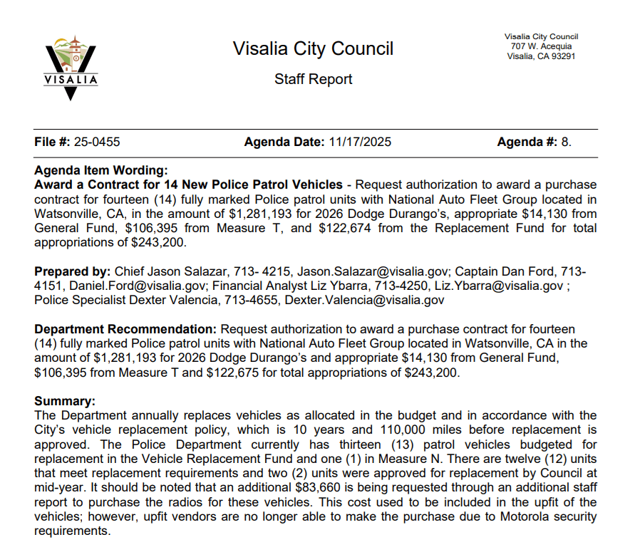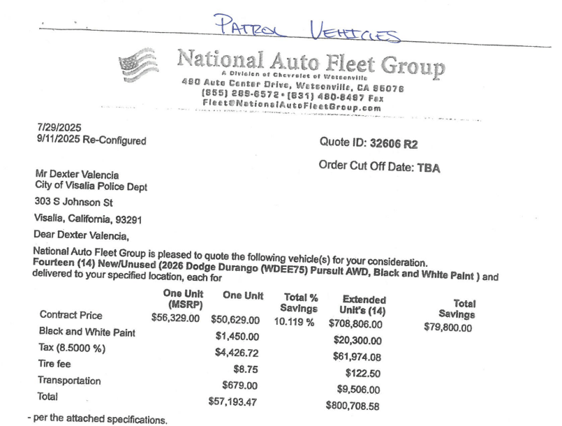 My request for information regarding the purchase and “upfit” of 14 new Dodge Durango Police SUVs landed in the Visalia City Clerk’s email Monday, 1/12/2026, and the response landed in my email Tuesday, 1/13/2026, shortly after 5pm. Talk about quick service!