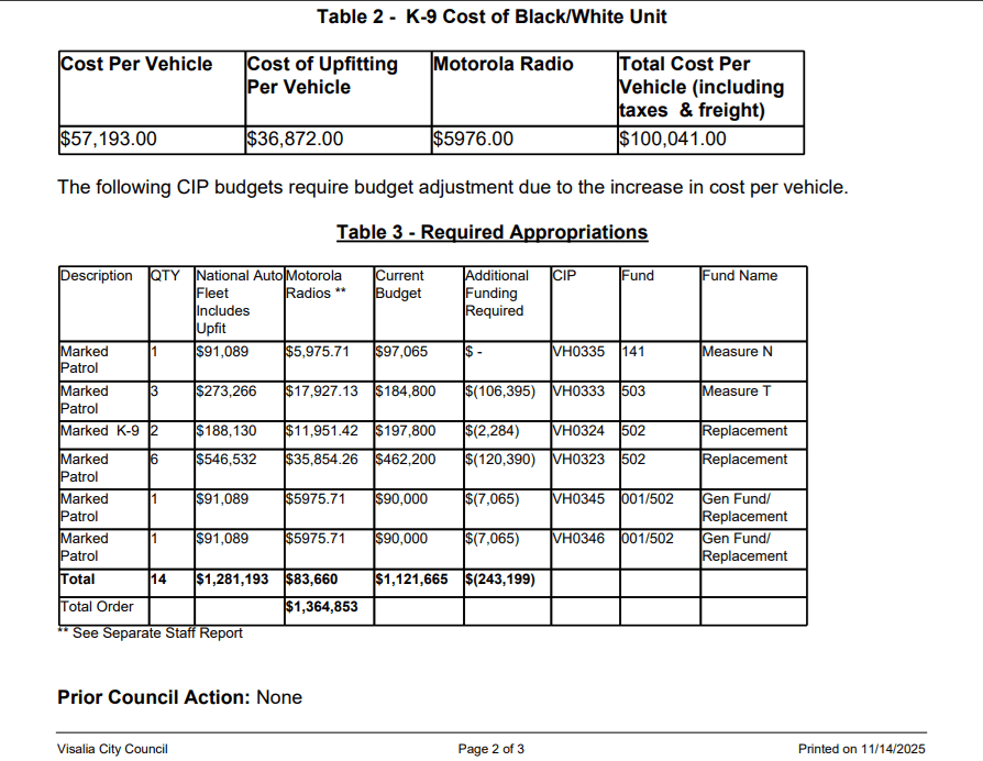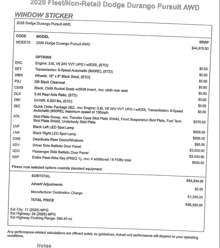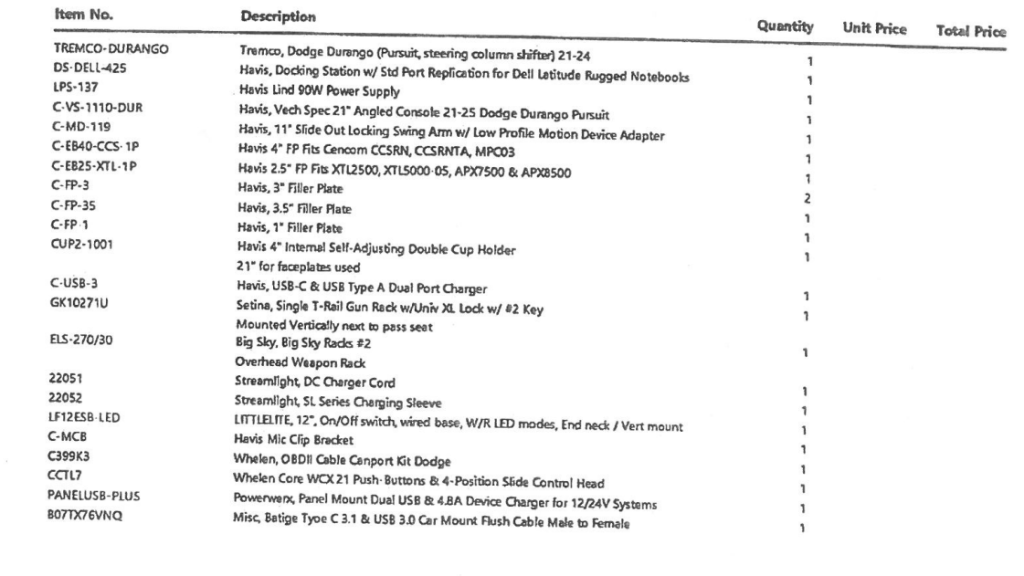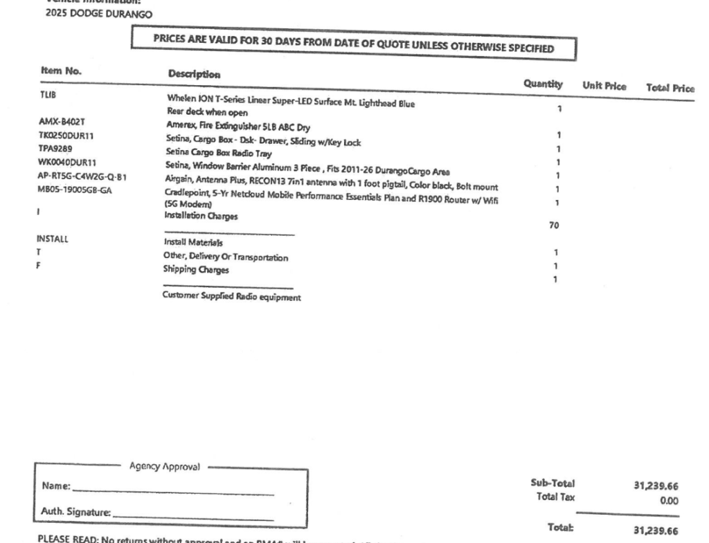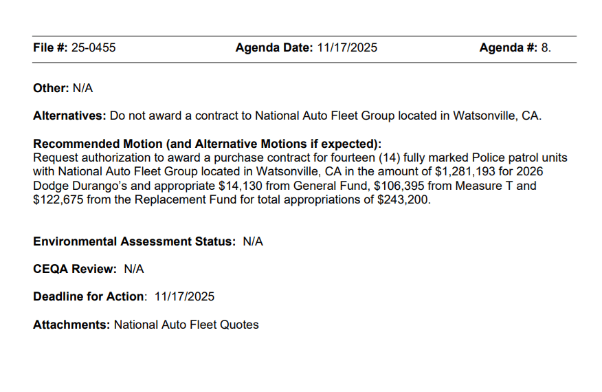 My request for information regarding the purchase and “upfit” of 14 new Dodge Durango Police SUVs landed in the Visalia City Clerk’s email Monday, 1/12/2026, and the response landed in my email Tuesday, 1/13/2026, shortly after 5pm. Talk about quick service!