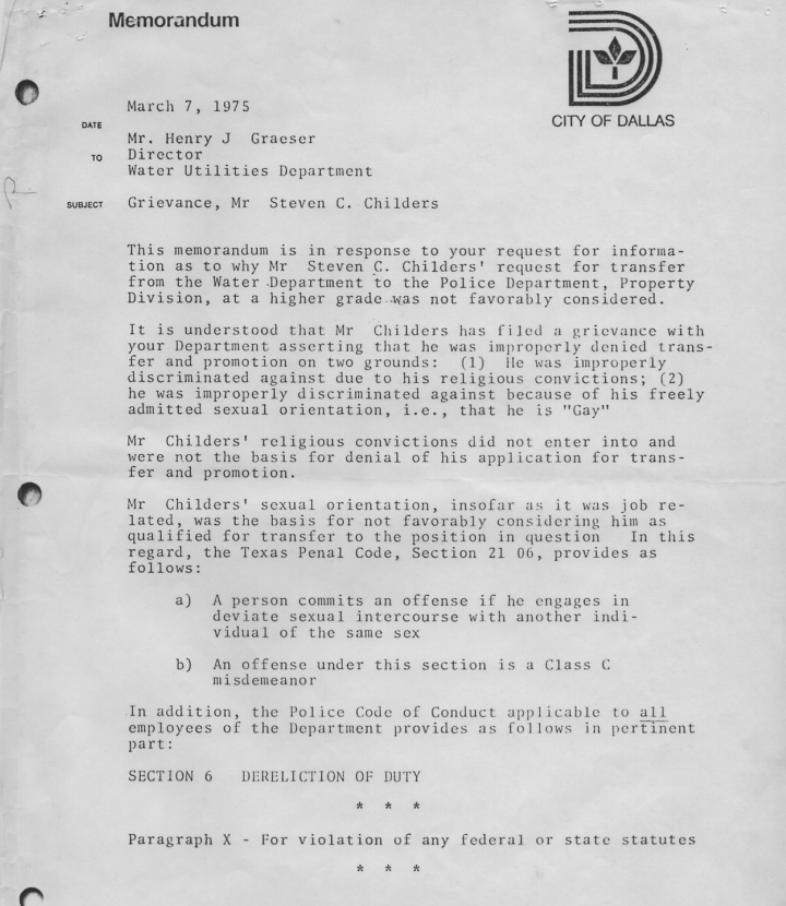 Later court and legislative battles are often remembered, like Lawrence V. Texas, California Propositions 22 and 8, and the Supreme Court of the United States case Obergefell V. Hodges. But in 1981, Childers V. Dallas was an early opening salvo in the battle for equality.