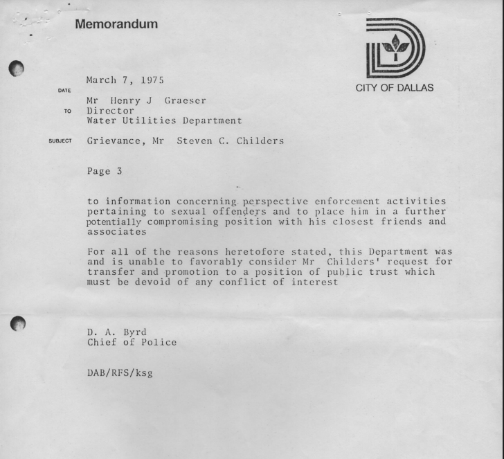 He filed complaints. They worked their way up the city’s “chain of command”. It even resulted in a letter from the Chief of Police, D.A. Byrd, to Slade’s department director, Henry J. Graeser. In that letter, Police Chief Byrd says
