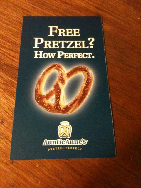 The TEDG “raffle” that is. Dolores always brings a little something to give away, and tonight’s prize was three free pretzels at Auntie Anne’s. Good stuff! I love them giant, hot, and salty!